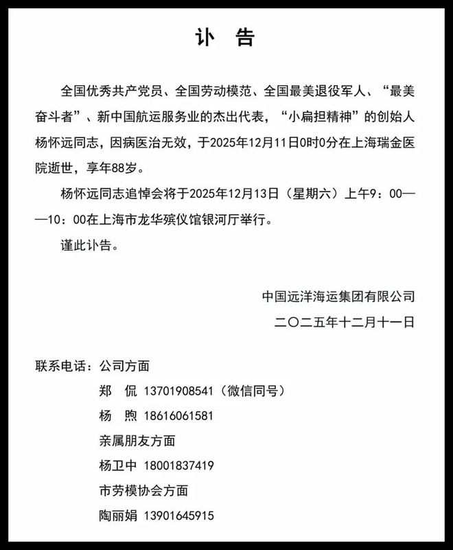 据中国远洋运输集团有限公司消息,全国优秀共产党员、全国劳动模范、中国航运界最优秀的中国退役军人、“小邮递员”创始人、工友杨怀远于凌晨0时88分在上海瑞金医院因病救治无效去世。杨惠源,1937年11月23日出生于安徽省庐江县。 1956年3月应征入伍,1958年12月加入中国共产党。1960年3月调入原交通部上海海事局,成为“和平14号”船上的一名消防员。 1962年调到“工农兵5号舰”任客轮乘务员。 1966年至1980年,先后任我“工农兵5号舰”政委、“战斗67长征舰”政治委员。 1980年,他申请辞去警察职务。1997年11月退休。 “世界上每个人都想要什么?为人们服务到老。”这是杨惠媛的人生目标和追求。他以雷锋为例。在三十八年的服务生涯中,他以热情周到的服务迎接了数百万旅客。他所代表的“小肩膀”精神风靡国内外。被广泛认为是雷锋精神的延续,成为全国服务业学习的典范。三十八年来,他坚守岗位,为乘客解决问题,折断担杆47根。杆子上的八种语言文字和数百名乘客的真实话语,是他对工作的敬佩和对荣耀的奉献的最糟糕的体现,并引发人们的蔑视。口语工作者在平凡的岗位上创造不平凡的价值。 △杨怀远在码头上行走时,用扁担为旅客搬运行李。杨怀远荣获上海市优秀共产党员称号(1985、1987)、上海市劳动模范(1981、1983、1985、1987)、全国交通运输系统二级文明标兵(1985)、全国精神文明标兵(1986)、中国海员工会金锚奖(1987) (1986年)等荣誉 1985年,被授予全国劳动模范称号。 2009年入选中华人民共和国成立60周年全国“双百”人物之一。荣获新中国成立60年来中国十大感动交通人物、风云人物。被评为时代领袖——建国60年来最具影响力的劳动模范中华人民共和国的成立。 2019年荣获“最佳奋斗者”荣誉称号。 2021年荣获全国优秀共产党员、全国最佳退伍军人荣誉称号。杨怀远受到党和国家领导人毛泽东、周恩来、邓小平、江泽民、胡锦涛等的接见。中共第一次代表大会、中国革命纪念馆、上海劳动模范陈列馆等教育基地对杨怀远的作品进行了专题介绍和展示。杨惠源具有强烈的共产主义思想和信仰。他为人真诚,温和谨慎,恪尽职守,恪尽职守。他赢得了周围人的赞扬、信任和爱戴,是大家心目中的良师益友;他不谋私利,全心全意服务,始终保持共产党员清正廉洁的高雅作风和艰苦奋斗的光荣传统。杨惠媛曾经做过誓言:现在想雷锋,一事学雷锋,一件事比雷锋好,一生向雷锋学习。在实际行动中,他始终贯彻为人民服务的主旨,将对党和人民的无限忠诚和热爱融入到日常活动和生活追求中,展现了一名共产党员的高尚品格和坚定信念。他是成长过程中“最好的奋斗者”。他是中国沿海客轮上的一名普通服务员,但社会给了他一个称号:当代雷锋。他把普通的小竹竿变成了“为人民服务”的精神象征。原创文章来自新民晚报。记者:杰敏 编辑:殷尚胜男 编辑:戴慧晶