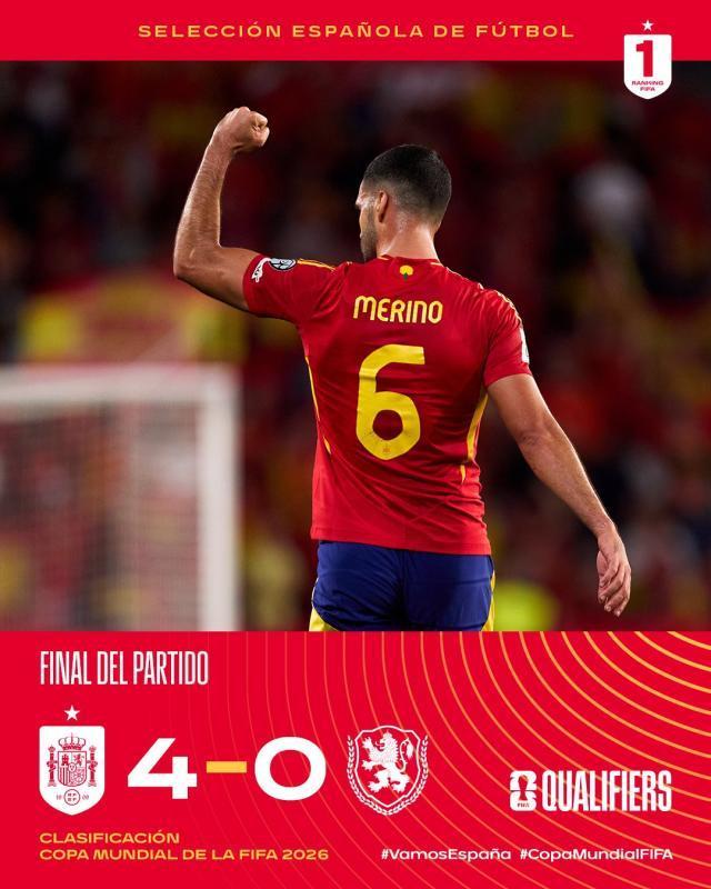 体育周刊全媒体原创 西班牙4-0保加利亚 35'美利奴、57'美利奴、79'切尔内夫(乌龙球)、90+2'瓦尔扎巴尔(点球) 世界杯欧洲组预选赛第8轮,完胜的西班牙在主场、小组赛下主场迎战保加利亚,打出了一定水平的主场、轮换。梅里诺上下半场两次头球破门,在比赛最后时刻得分。切尔内夫自摆乌龙,奥亚扎瓦尔点球破门,西班牙4-0击败保加利亚。 35分钟,苏维门迪送出传球,莱诺曼德头球攻门飞出。梅里诺在门前摇头,进球了。西班牙1-0打破僵局。 -57分钟,格里马尔多下底送出传中,梅里诺后点跳射头球破门,两次完成比分。西班牙2-0保加利亚。第79分钟,阿莱克斯·加西亚送出传中,切尔内夫门前自摆乌龙。西班牙3-0击败保加利亚。受伤时,美利奴在抱球时被踢球到了禁区,裁判肯定判罚了点球。奥亚萨瓦尔已经能够罚点球了。西班牙4-0击败保加利亚。西班牙首发阵容:UNAI西蒙/波罗、莱诺曼德(71'比维安)、拉波尔特、格里马尔多/苏维门迪(63'亚历克斯·加西亚)、佩德里(68'巴勃罗·巴里奥斯)/奥亚萨瓦尔、梅里诺、巴埃纳(63'耶利米·皮诺)球队保持着29场比赛的倒霉记录,德尔教练创造的球队历史上没有输家 博斯克在2010年和2013年的2026年世界杯预选赛欧洲小组赛第一阶段中,6号梅里诺攻入6球,成为本阶段进球最多的中场球员。4号勒诺曼在过去4场为俱乐部和国家队比赛中攻入4球(2球2助攻),追平了他此前各项赛事103场比赛的进球贡献值。文/刘丽
